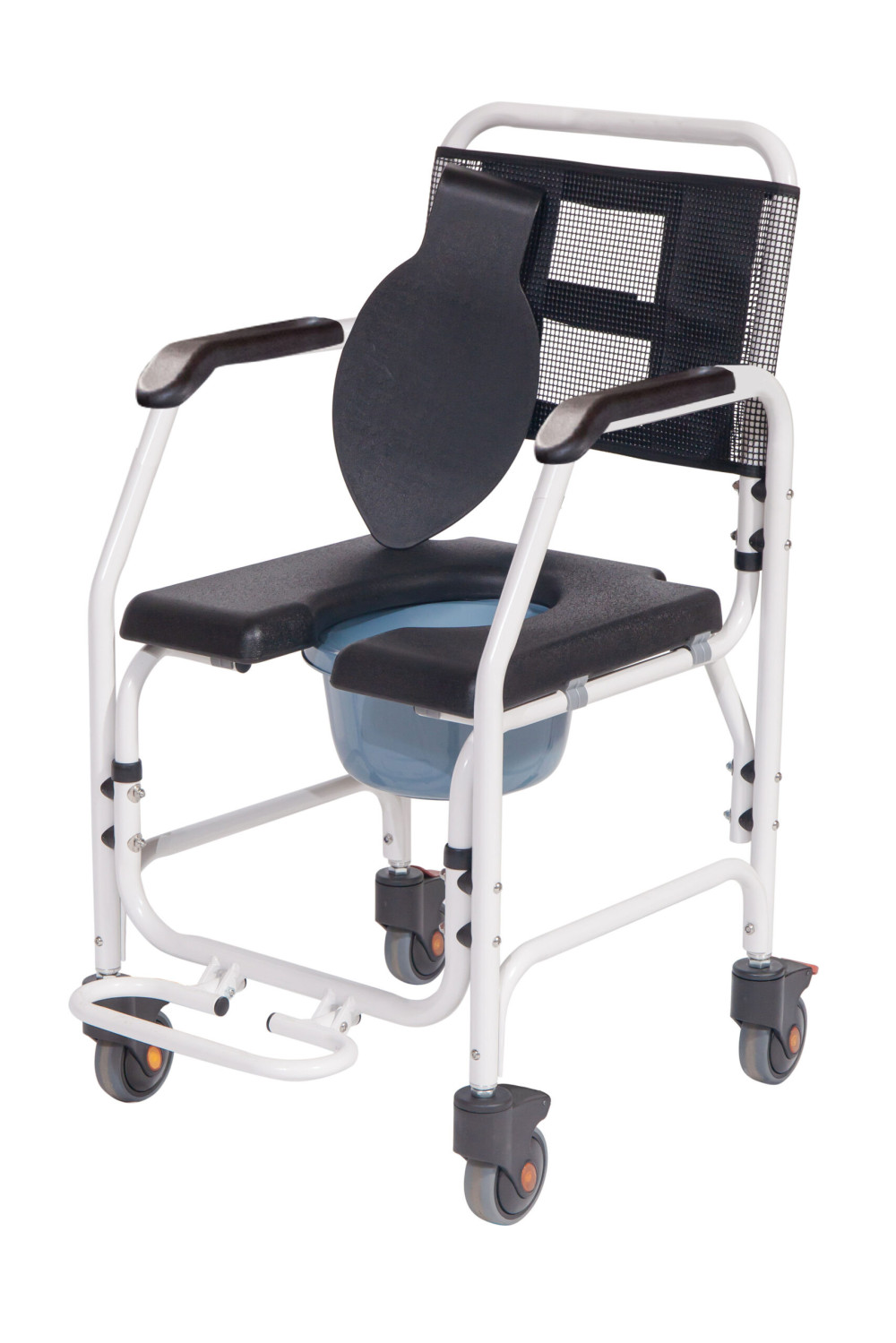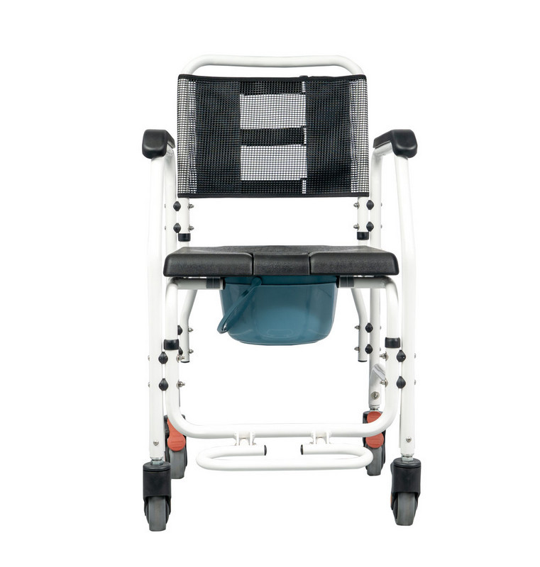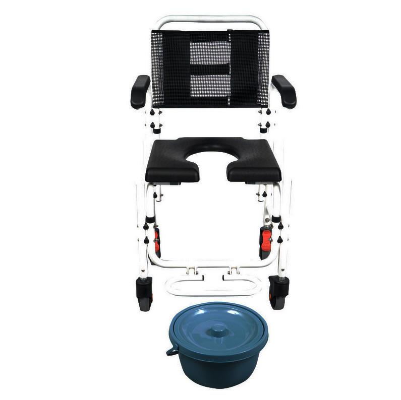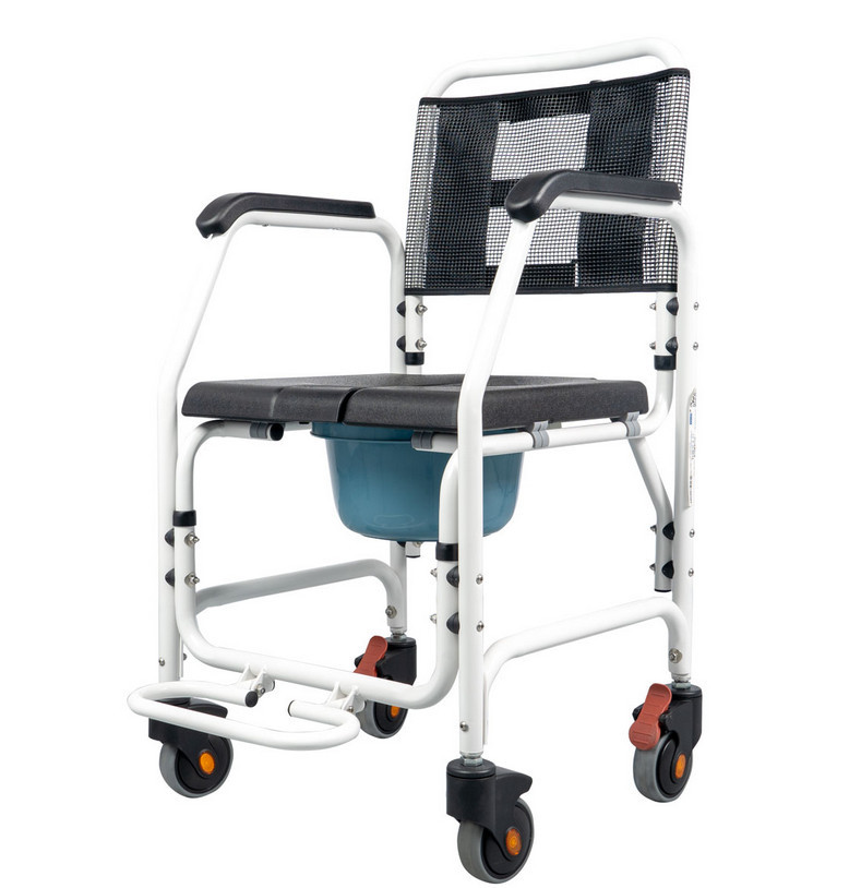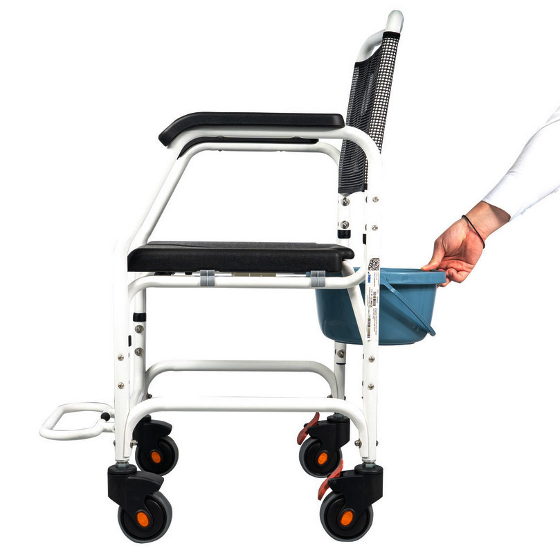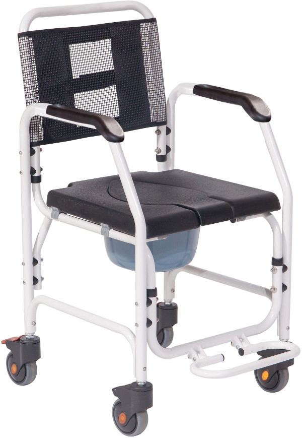 Az Asper fürdőszobai gördíthatő fürdetőszék alumíniumból készült, színe fekete-fehér. Az Asper fürdőszobai fürdetőszék és szoba wc a személyi higiénia hasznos eszköze, akér szoba wc-ként akér zuhany székként is hazsnálható. Vízálló poliuretán (PU) üléssel, stabil karfákkal és lehajtható lábtámasszal rendelkezik. Kerekei fékezhetőek, ami biztonságot és stabilitást kínál. Alkalmas a páciens általi zuhany alatti használatra.
