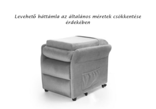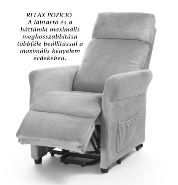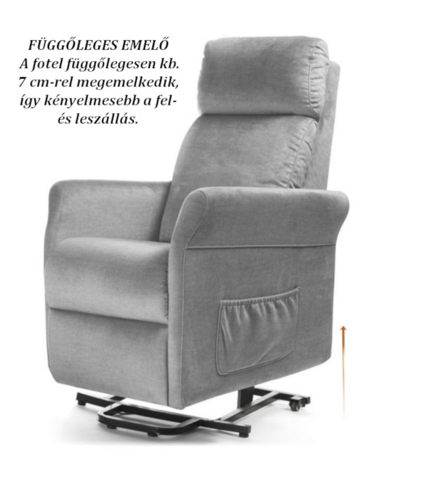 Méretek és súly: Ülés (beülő) szélesség 50 cm Ülés magsság 45 cm Ülés mélység 48 cm Teljes szélesség: 70 cm Hosszúság: 90 cm Magasság (padlótól a karfáig) 61 cm Teljes magasság 110 cm Hosszúság ( a fotel fekvő helyzetben) 162 cm Emelkedés/Lift funkció 7 cm Magasság (emelkedés közben) 140 cm Maximális teherbírás 130 kg A termék súlya 45 kg Az itt található információk a gyártó által megadott adatok.