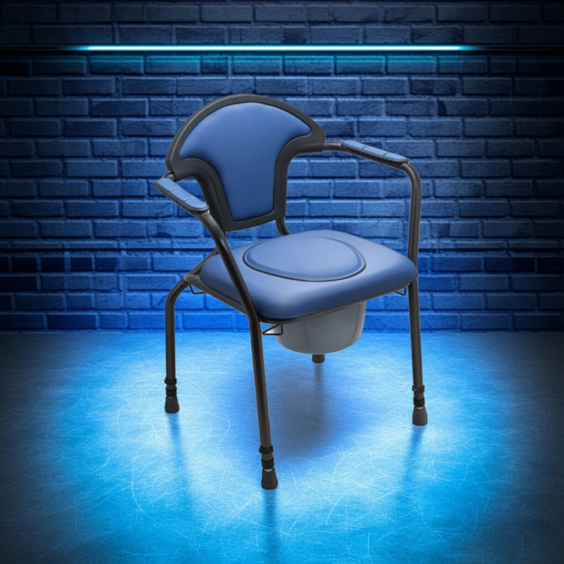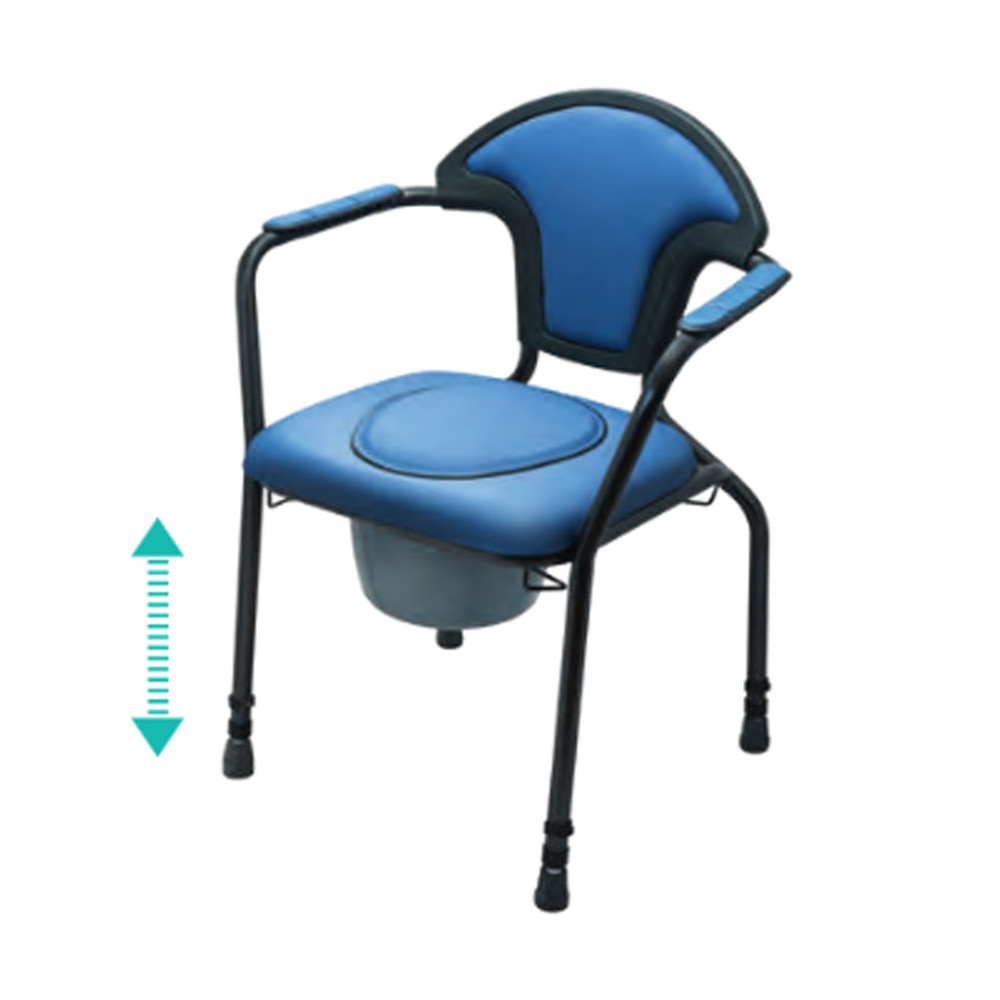 Szivacsos ülőfelületű, karfával és háttámlával ellátott álíltható magasságú szoba wc.