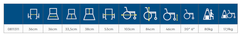 Keret Acél-Összecsukható Ülés és háttámla anyaga Oxford szövet, égésgátló tulajdonsággal Kartámaszok Felhajtható Lábtámaszok Eltávolítható vagy oldal irányba kihajtható lábtámaszok, állítható hosszúsággal Hátulsó kerekek 20" Tömör Elülső kerekek 6" x 1" Tömör Fékek A hátulsó kerekeken