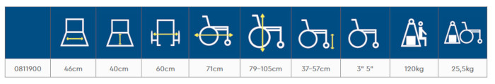 KERET Acél ÜLŐPÁRNA Levehető, mosható huzattal HÁTTÁMLA ÉS KARTÁMASZ ANYAGA PE HÁTSÓ GÖRGŐK 3" azaz (7,6 cm) ELÜLSŐ GÖRGŐK 5" (12,7 cm) FÉKEK Elülső és hátsó görgőkben LÁBTARTÓ Lábtartó platform