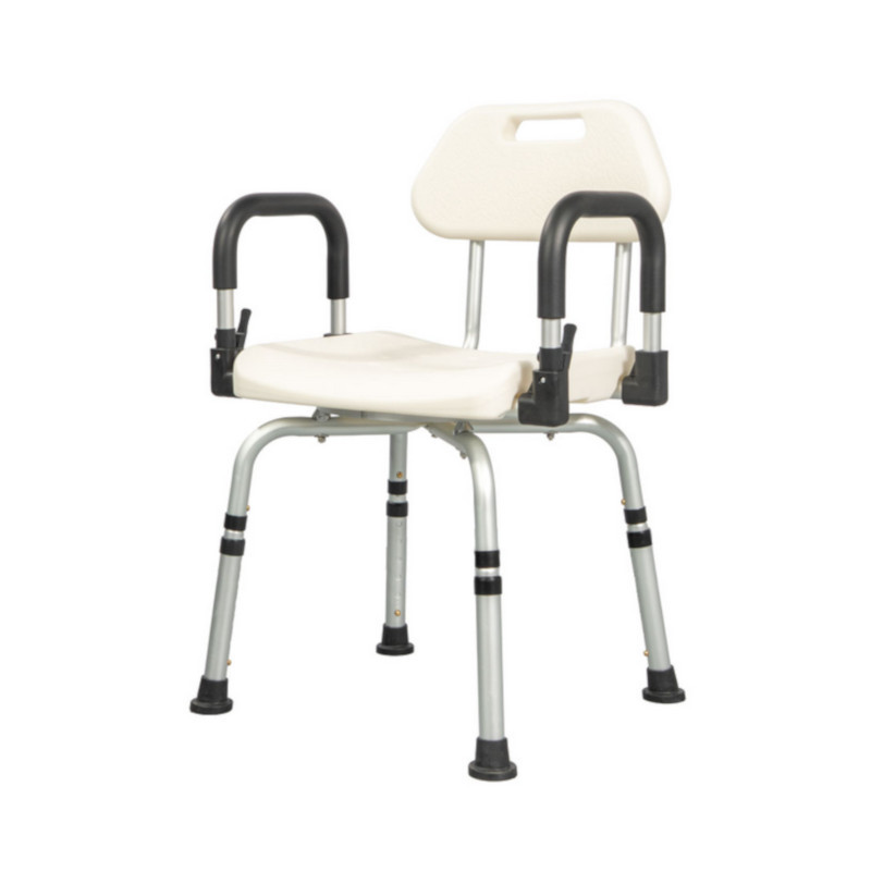 A szék speciális gumitalpakkal van ellátva, amelyek stabil rögzülést biztosítanak a padlóhoz, illetve a zuhanyfelülethez. A magasság állíthatósága révén minden felhasználó beállíthatja a számára legmegfelelőbb pozíciót. A háttámla extra biztonságot ad, az emelhető karfák pedig egyszerűbb leülést és felállást tesznek lehetővé. A 360°-ban elforgatható ülés még szűk helyen is kényelmes mozgásteret ad. Az alumínium váz könnyű szerkezetet jelent, amely egyben stabil és könnyen mozgatható.