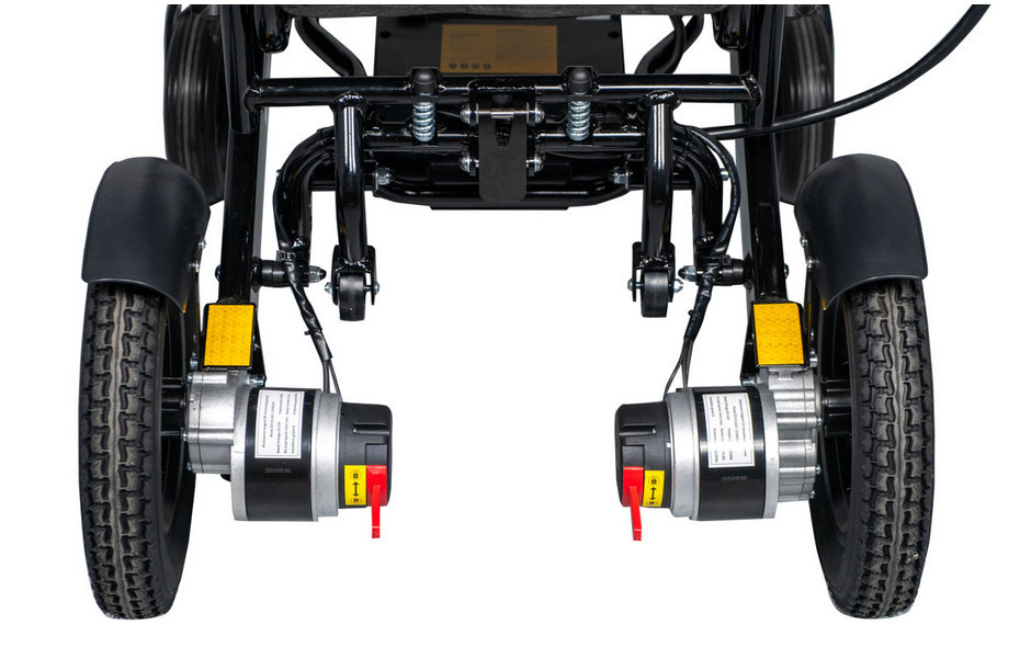 A 12 colos légnyomásos hátsó kerekek és a 8 colos tömör első kerekek kombinációja különböző felületeken történő haladást tesz lehetővé. A billenésgátló görgők és az elektromágneses fékrendszer a használat során fontos szerepet töltenek be.