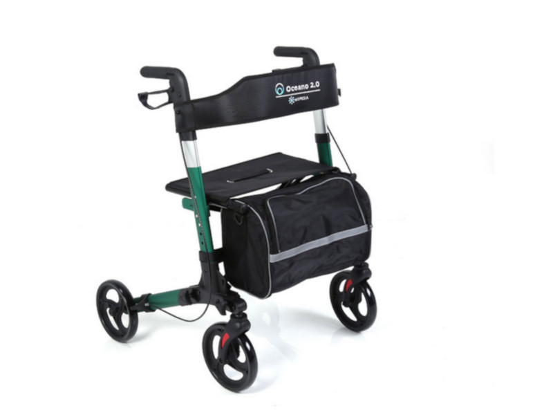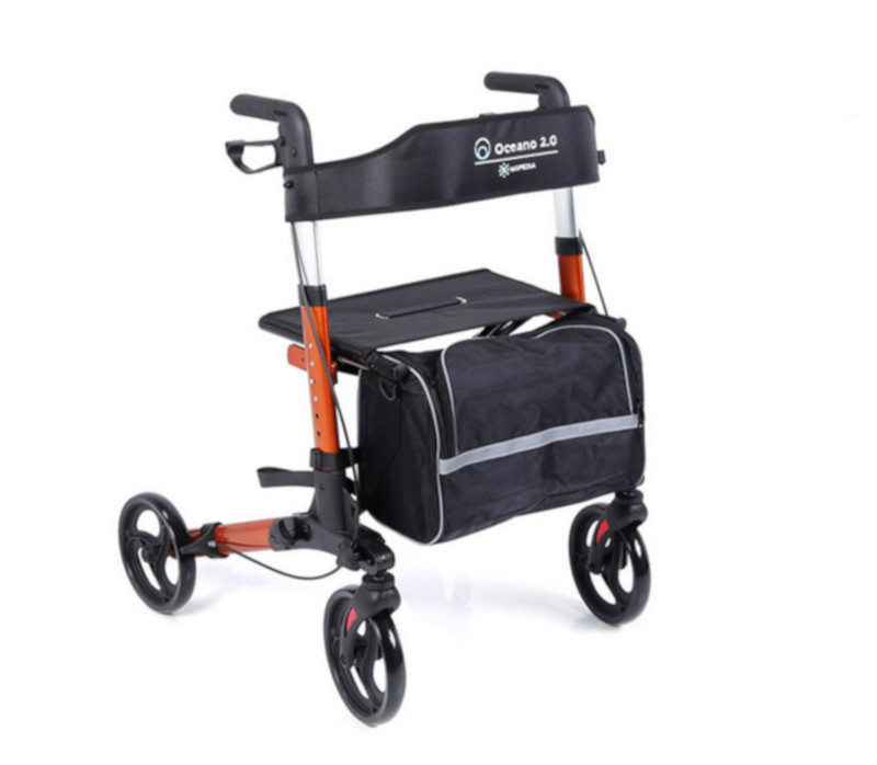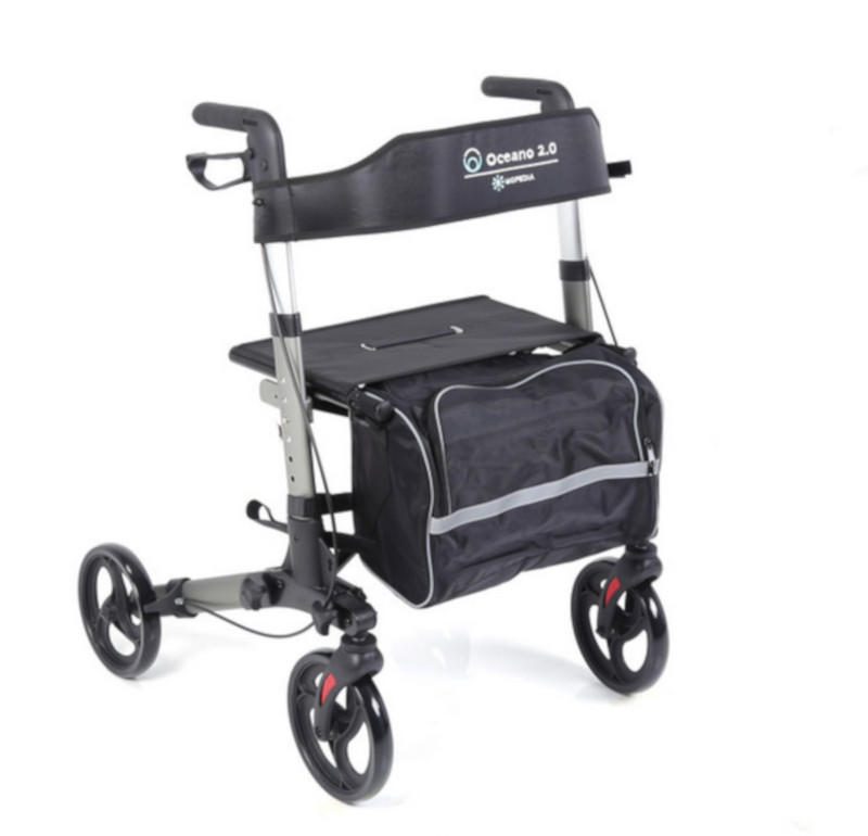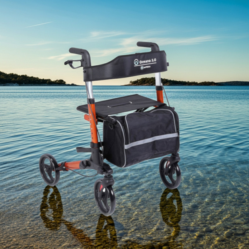 Az OCEANO 2.0 összecsukható rollátor egy biztonságos és könnyen mozgatható eszköz, amely segít a mindennapi közlekedésben. Az alumíniumból készült szerkezet könnyű, mégis stabil, így kényelmes és megbízható használatot biztosít. A négy darab 20 cm átmérőjű kerék lehetővé teszi a zökkenőmentes haladást: az első kerekek forgathatók és reflektorral ellátottak, míg a hátsó kerekek fixek és kétfunkciós fékrendszerrel rendelkeznek.