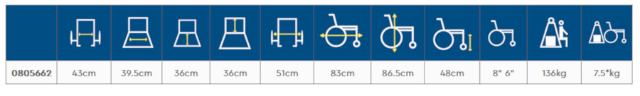 Keret Alumínium - Összecsukható Ülés és háttámla anyaga Poliészter és PVC Kartámaszok Felhajtható Lábtámaszok emelőképességgel Hátulsó kerék 8" = 20 cm Tömör Elülső kerék 6" = 15 cm Tömör Kísérő fékek Igen Max. terhelés 136 kg Biztonsági öv Igen Speciális fogantyú a könnyű szállításhoz Igen