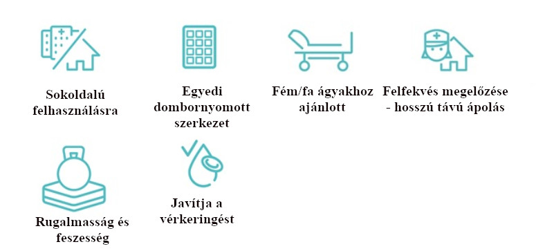 A matrac alkalmazható olyan betegek esetében, akiknél az I. stádiumú felfekvés kockázata fennáll. A felület kialakítása segíthet a megfelelő testhelyzet fenntartásában és a terhelés csökkentésében.